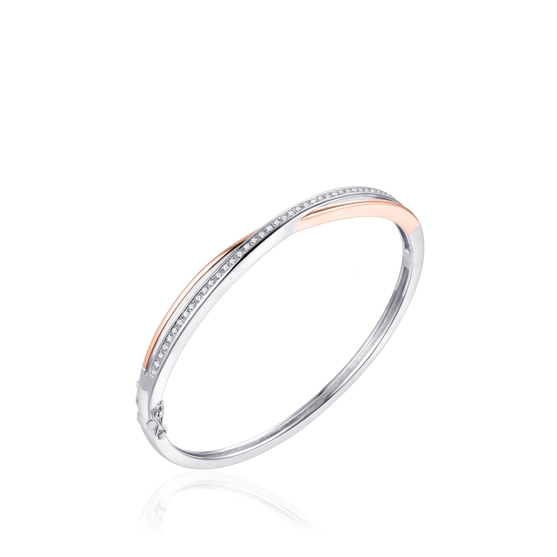 This bangle is made of recycled 925 sterling silver and finished with a rose gold plating, embedded with cz stones. The plating has been given an e-coating for extra shine and durability to your bangle. The bangle is hinged with safety fasteners, 68cmm wide